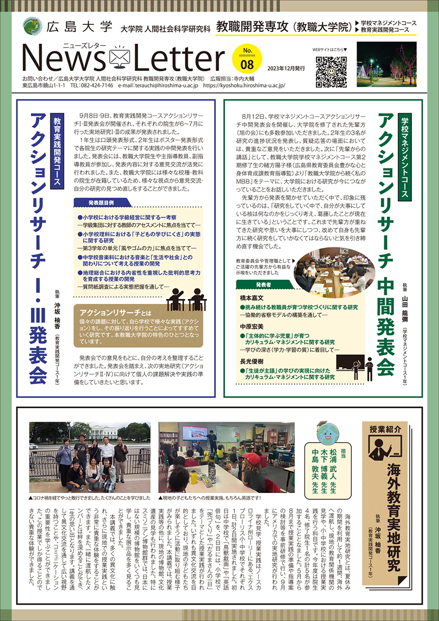 開設以来、教員を志望した修了生は100%が教員として採用され、広島県内外で教鞭をとっています(含非常勤、臨採)。また、修了した現職教員は、教頭2名、教育委員会係長級1名、指導主事2名が登用されるなど、各方面で活躍しています。